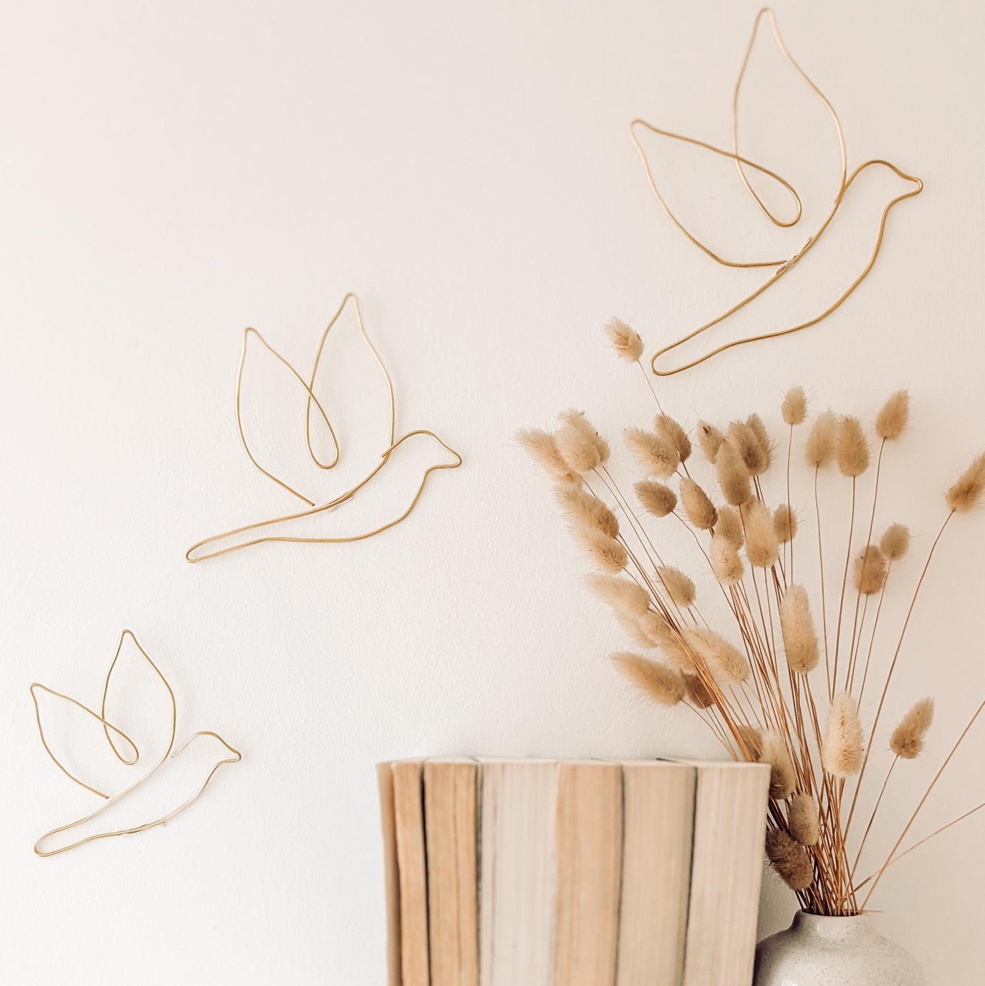 Trio d'hirondelles en fil de métal doré pour décorer vos murs de façon poétique. Dans un salon, une chambre, un escalier, ou une entrée..... laisser les s'envoler et donner vie à votre intérieur.