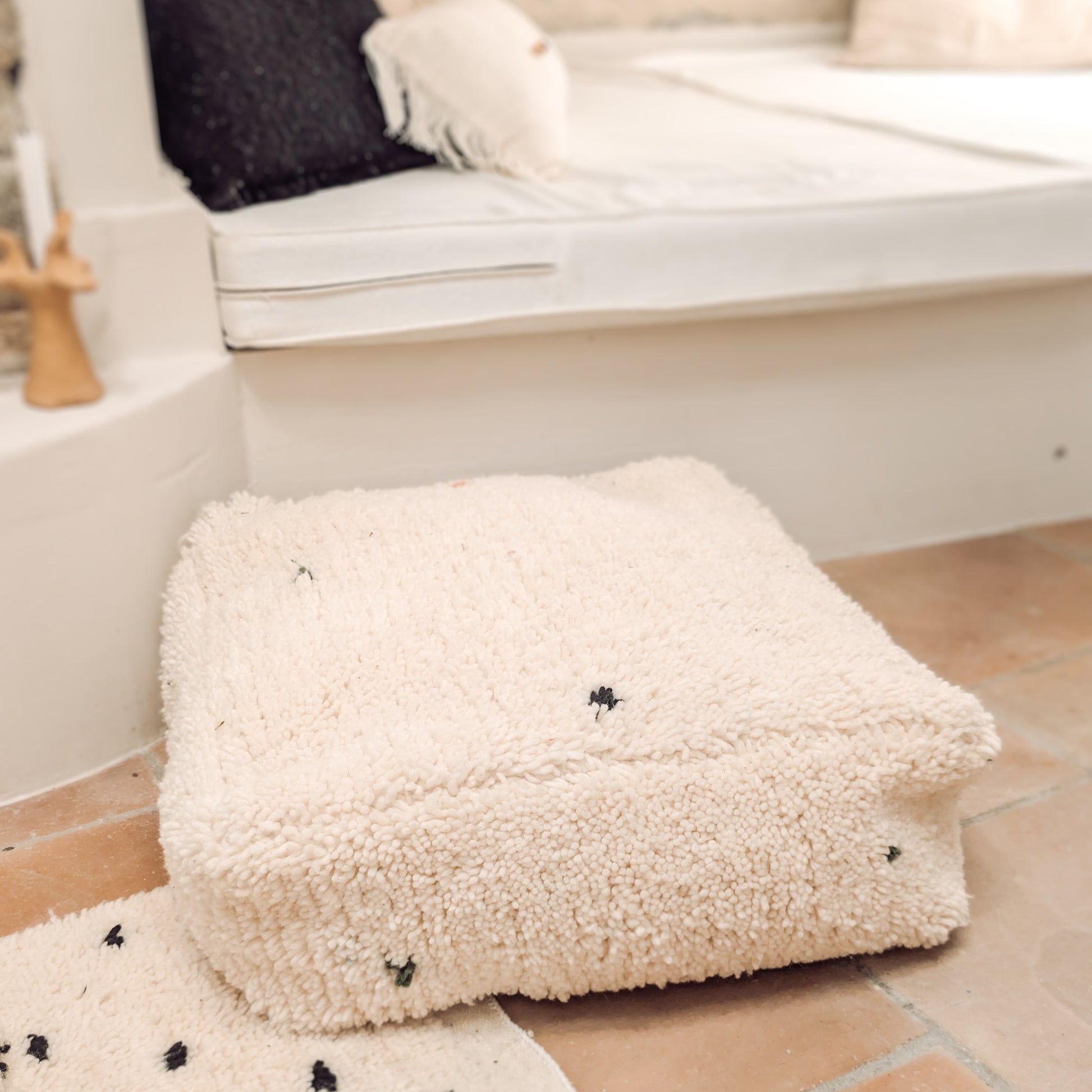 Ce magnifique pouf est tissé à la main par les talentueuses femmes de l'Atlas au Maroc. Il est confectionné à partir d'un véritable tapis Beni Ouarain.