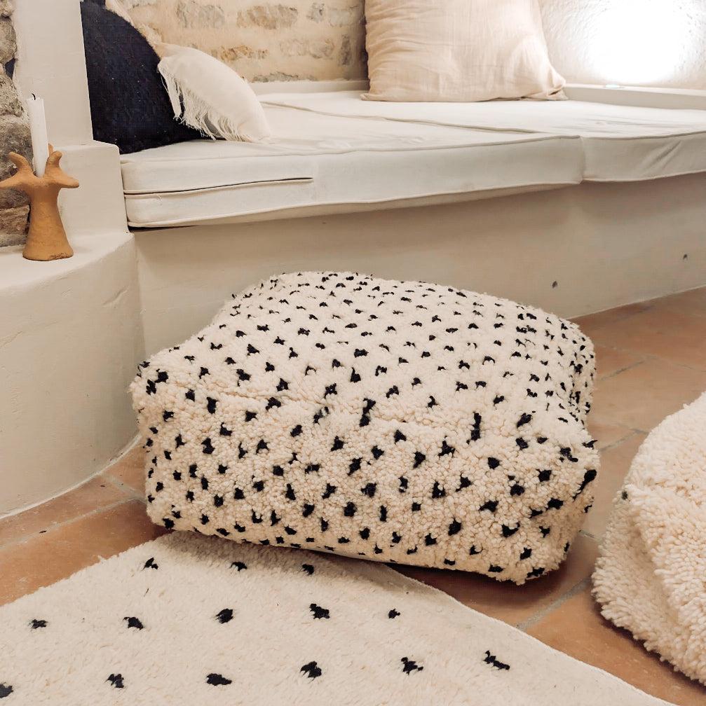 Ce magnifique pouf est tissé à la main par les talentueuses femmes de l'Atlas au Maroc. Il est confectionné à partir d'un véritable tapis Beni Ouarain, arborant les motifs caractéristiques de ces tapis emblématiques du Maroc.