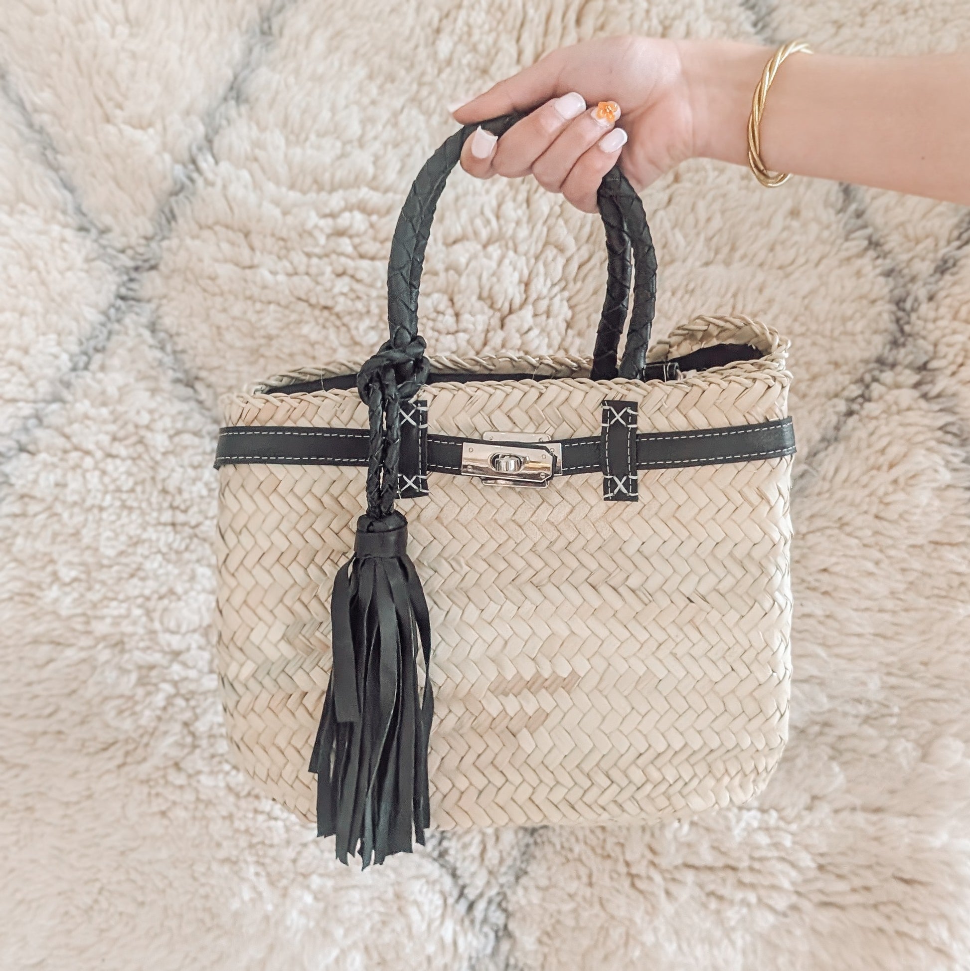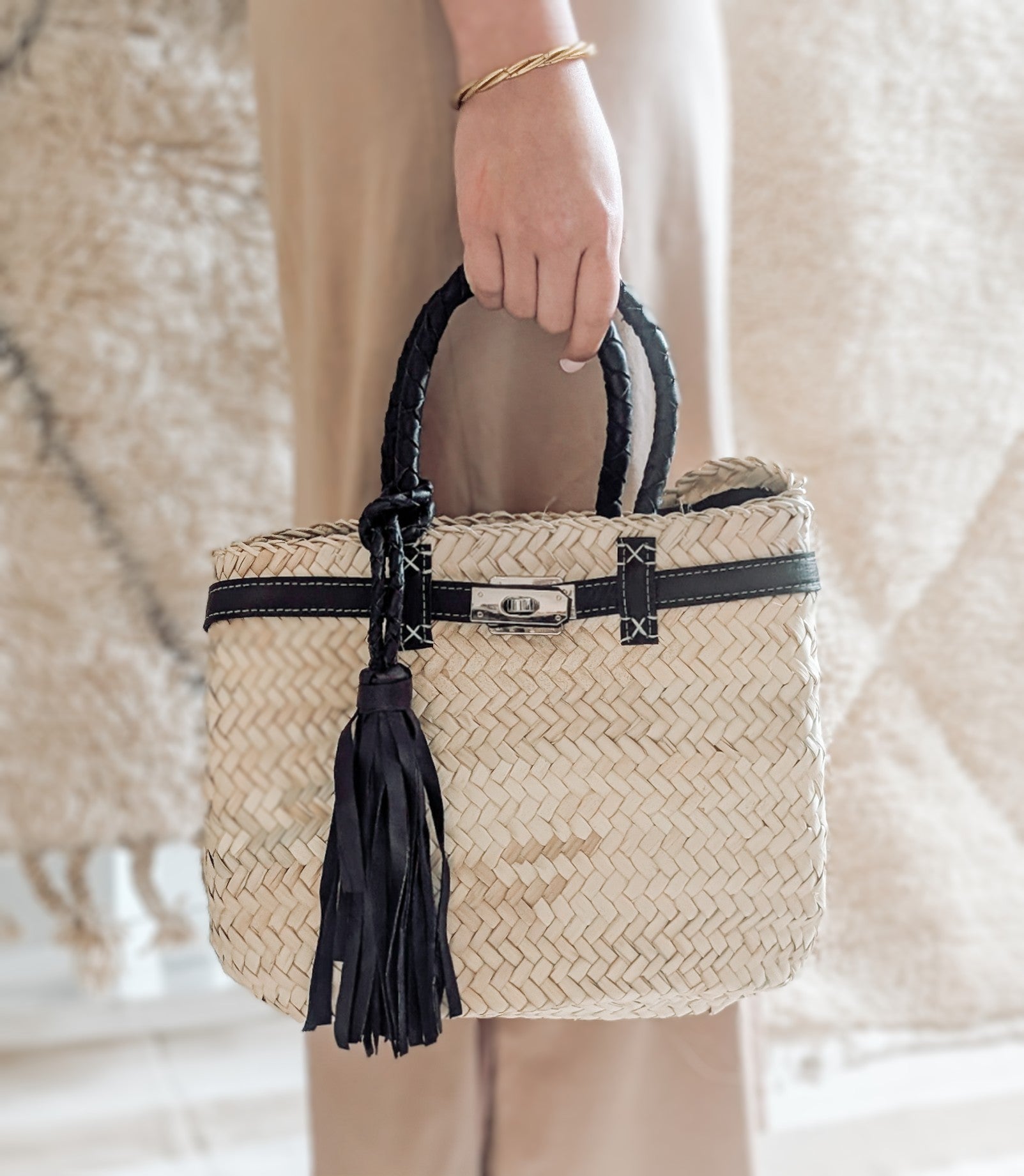 Sac à main en feuilles de palmier fait main selon la tradition de l'artisanat marocain. Il possède une grande anse ajustable en cuir noir pour le porter à l'épaule ainsi que 2 poignées en cuir. Il est entièrement doublé à l'intérieur avec une petite poche intérieur.