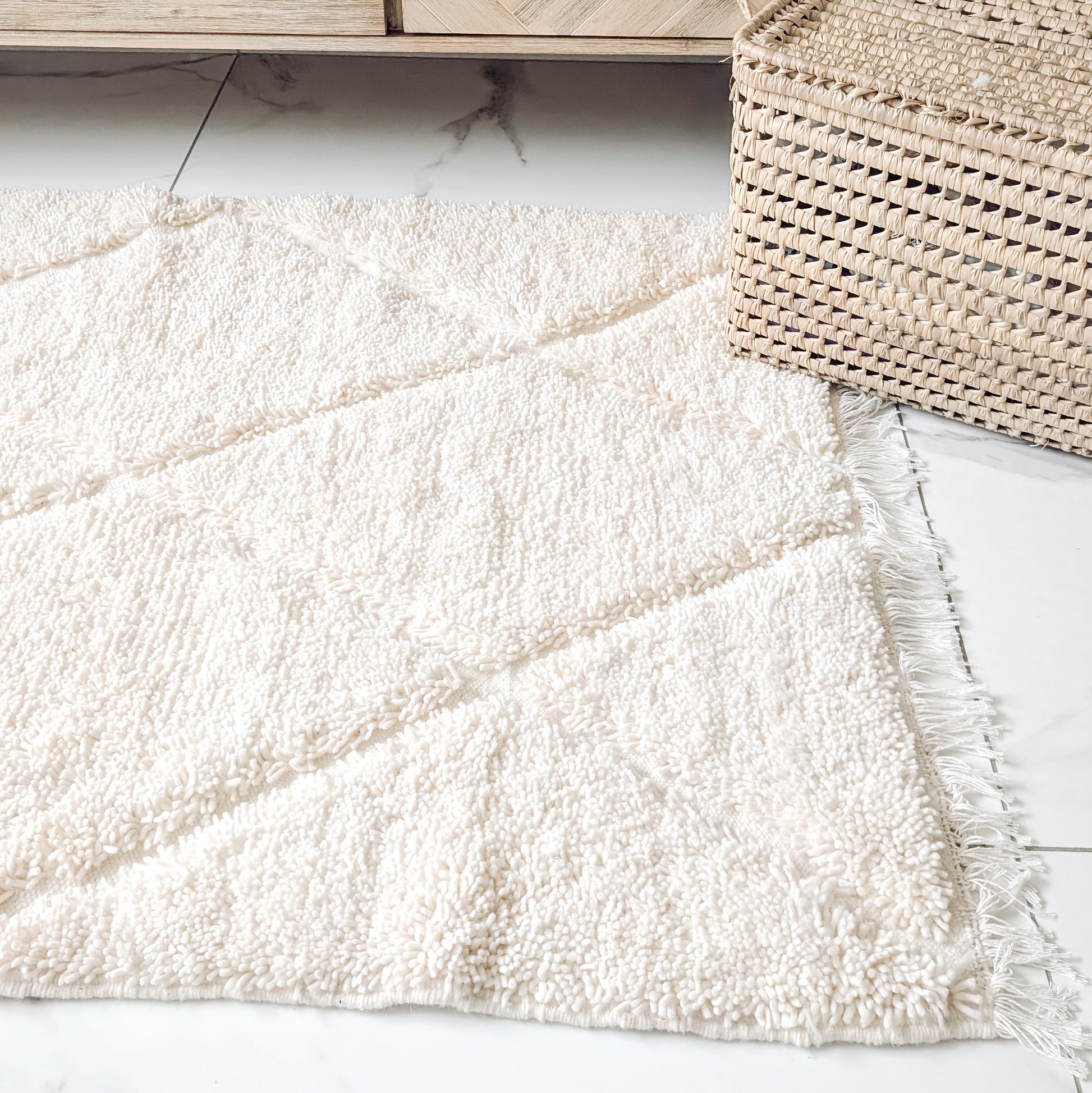 Ce tapis Beni Ouarain en pure laine est soigneusement fait à la main par les tisseuses de l'Atlas au Maroc. Il est idéal pour sublimer n'importe quelle pièce de votre intérieur. Que ce soit au pied de votre lit, dans votre salon, dans un espace de lecture, ou une entrée, il apportera une ambiance accueillante et cosy.